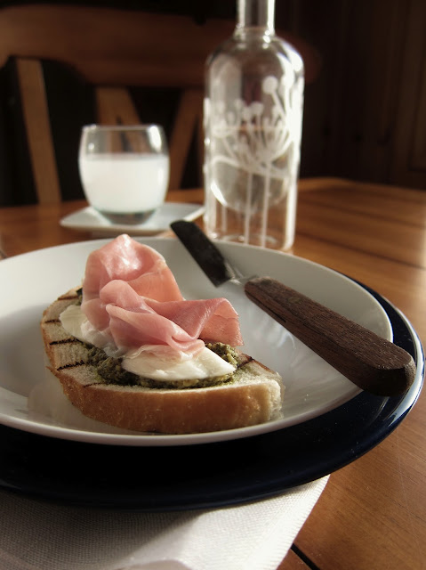 The Donna Hay Styling and Photo Challenge is sponsored by Simone at Jungle Frog Cooking. Anyone is welcome to participate at any time. I recommend it as a way to think about how you take photos and set them up. Each month a different photo is chosen by Simone from a Donna Hay Magazine. This months challenge was Bruschetta with Arugula Pesto, you can find the challenge along with the recipe at the link above. This months photo was from Donna Hay's Seasons Cookbook, the photographer was Con Poulos. You can see the side by side comparison below, the original Con Poulos photo is on the left and my interpretation is on the right (like I needed to clarify that).